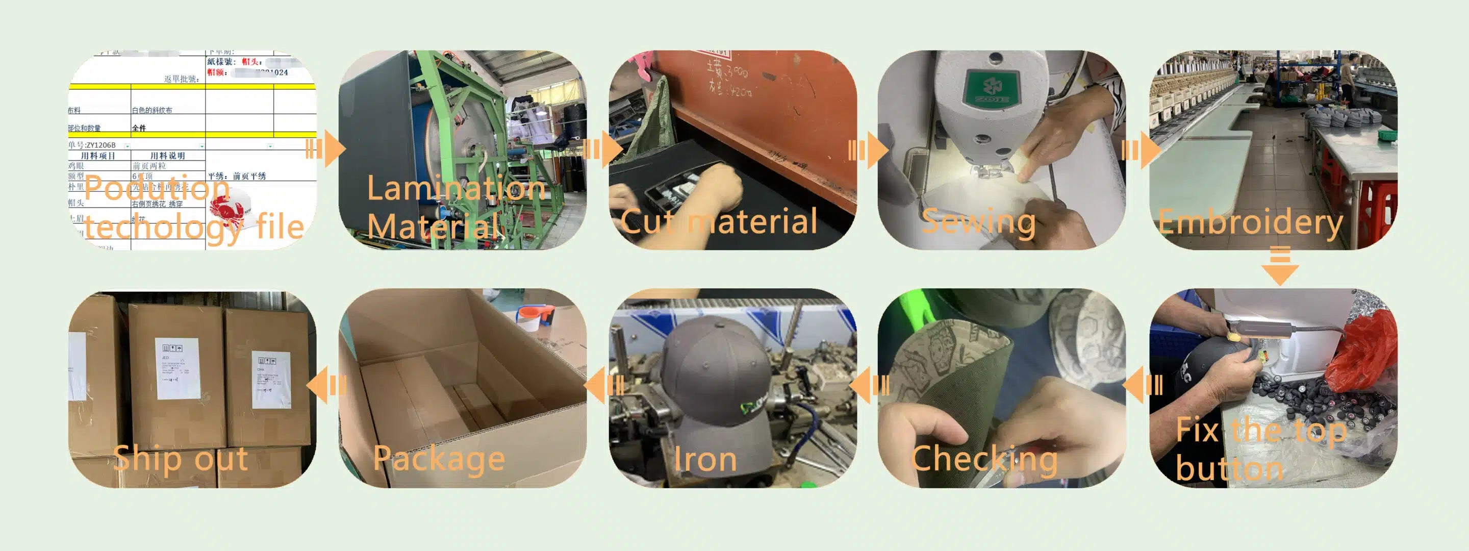 • Process of production a hat :  Artworkl-Lamination material-Cut material-Sewing -Fix the top button Button on the hat crown-Checking – Iron hat-Package-Shipping